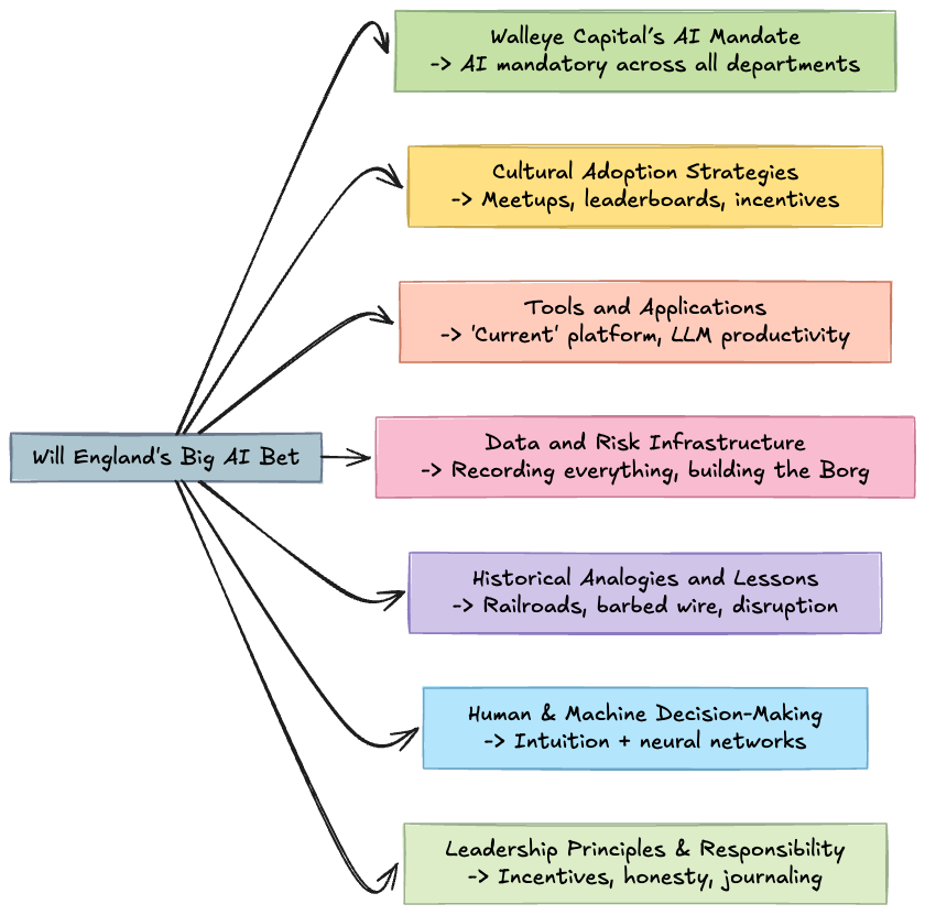 He also uses the metaphor of the American frontier to describe how technology adoption works. Startups are like cowboys—pushing into uncharted territory, experimenting, and breaking rules. Larger institutions, by contrast, act as the builders of civilization: they bring order, scale, and governance once the frontier is established. England sees AI as today’s frontier. The first movers push boundaries with speed and experimentation, while established firms like Walleye have to balance that frontier spirit with the resources and discipline needed to operate at scale.