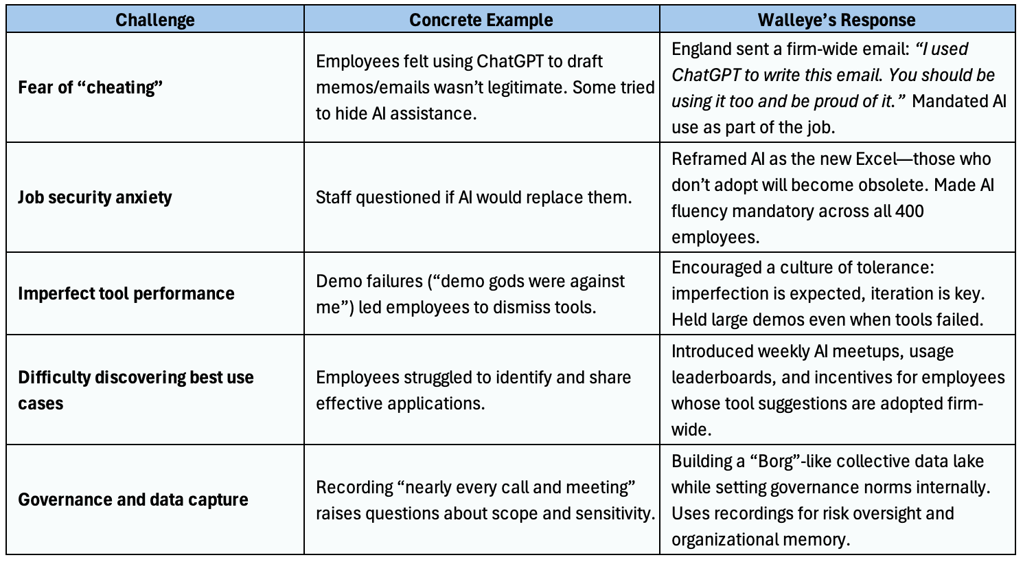 In his eyes, it would be irresponsible for leadership to allow Walleye to fall behind when competitors are already moving quickly. By making adoption mandatory and leading by example, England aimed to give the firm an organizational edge, ensuring that every team member, regardless of role or technical background, benefits from the productivity lift AI offers.